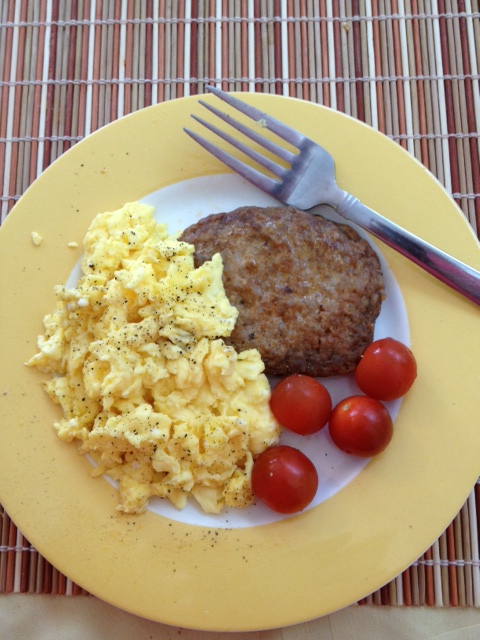 Today? Two eggs, some cherry tomatoes and a chicken sausage patty. All is right with the world.