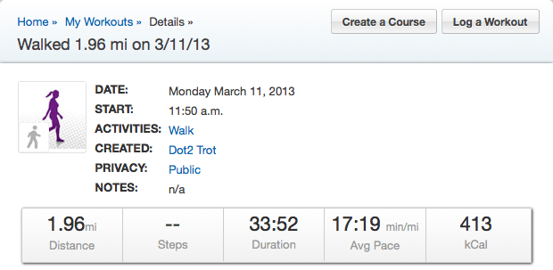 Good progress on the walk today. I’ve reduced my overall pace by 2 minutes, going from 18:48 to 16:46/mile. Sweet. Tomorrow we’ll see if I can do this two days in a row or if yesterday’s day off skewed today’s results.